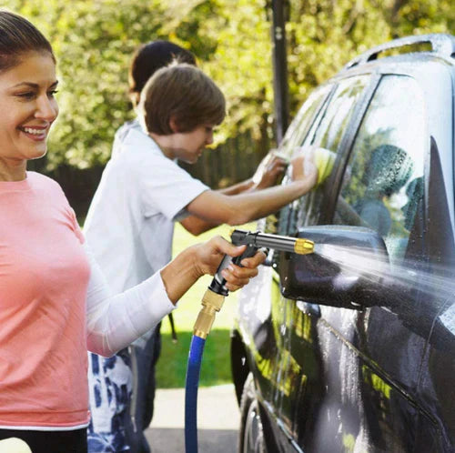 Alta Pressão Ajustável: Fornece até 10 vezes mais pressão que mangueiras convencionais, perfeita para limpar jardins, calçadas, veículos, móveis externos, piscinas ou regar plantas e gramados.