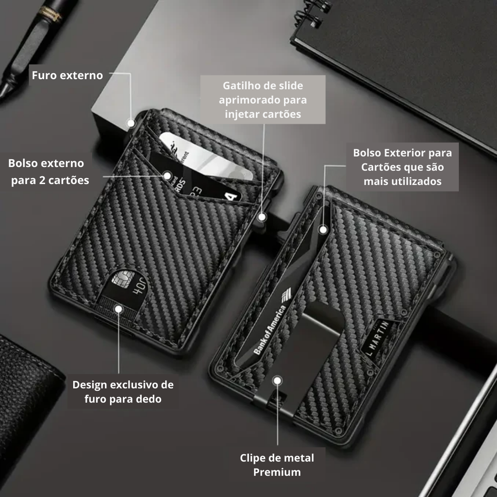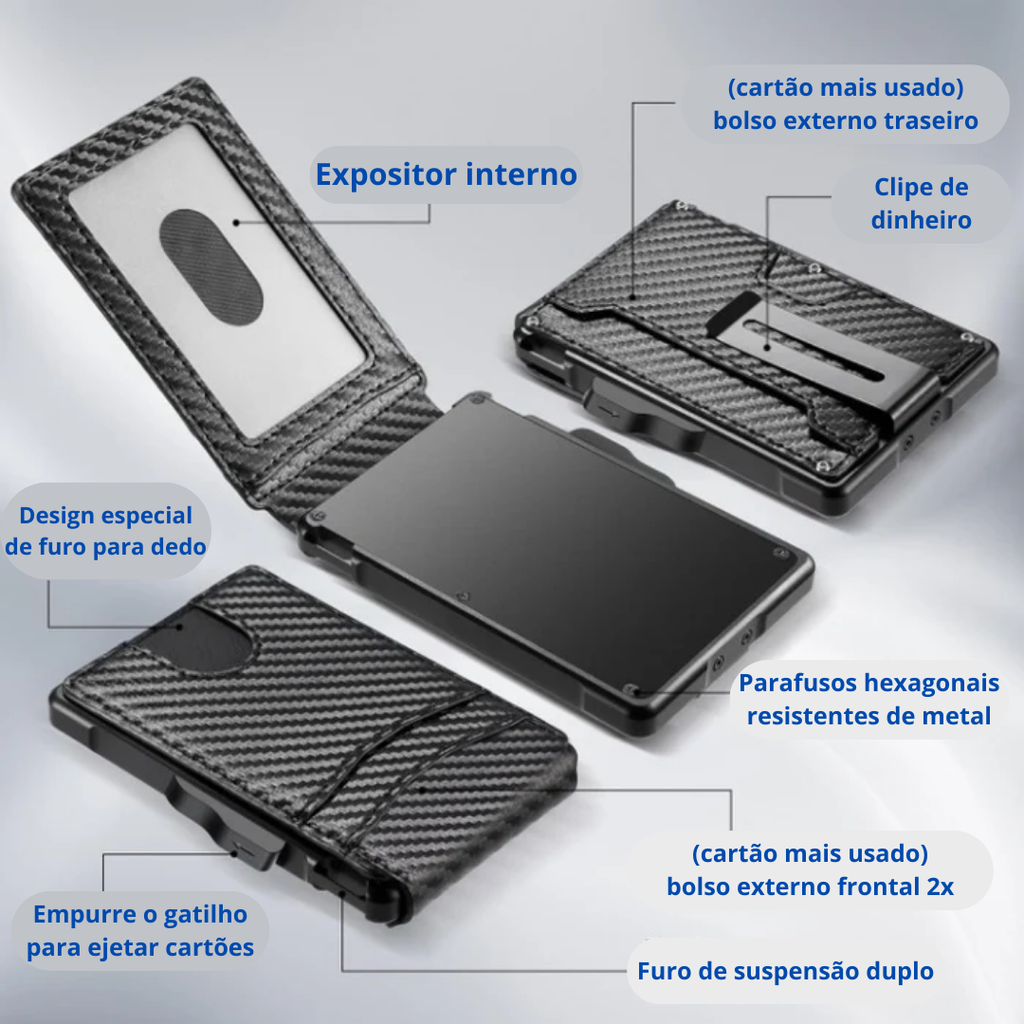 Cansado de carteiras volumosas? Mude para a carteira pop-up ultrafina Luxium™ – um acessório moderno e elegante criado para uma experiência premium de transporte, com a nova tecnologia de bloqueio RFID, que te protege contra roubos.